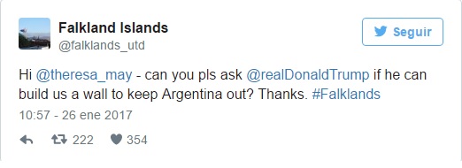 Desde una cuenta de Twitter creada por un grupo de kelpers, le escribieron a la primera ministra británica para que le pida al presidente de los Estados Unidos que construya un muro para mantener "a la Argentina afuera".
