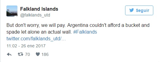 Un grupo de kelpers le pidió por Twitter a la primera ministra británica, Theresa May, que le solicite a Donald Trump la construcción de un muro "para mantener a Argentina fuera". "No se preocupen, pagaremos por él", ironizaron.