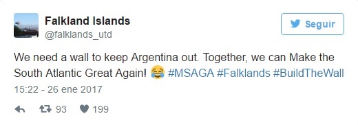 "Necesitamos un muro para mantener a Argentina fuera. ¡Juntos podemos hacer que el Atlántico Sur vuelva a ser genial! #MSAGA #Falklands #ConstruyamosElMuro", insistieron de forma irónica.