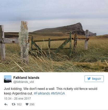 Por último, decidieron cerrar el tema: "Es una broma. No necesitamos una pared. Esta valla vieja y desvencijada mantendría a Argentina fuera. #Falklands #MSAGA".